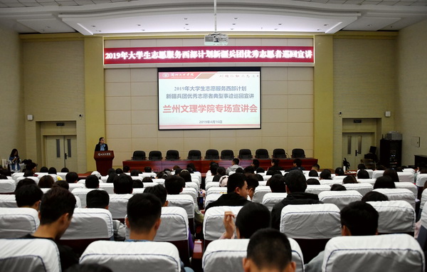 宣讲会上,首先播放了2019年西部计划宣传片。通过观看视频短片,使在场同学对西部计划志愿服务有了憧憬和向往。接着,新疆兵团优秀志愿者韩自超、李明晖、张浩分别以生动幽默的语言分享了自己的志愿服务经历。最后,吕雅琴副书记详细介绍了新疆志愿者的补贴标准,政策保障及留疆政。完善的政策支持和精彩的志愿生活进一步激发了同学们对西部生活的向往和奉献社会的愿望。