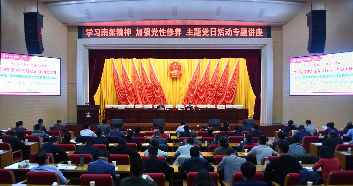 2019年4月19日晚7点30分,Beat365唯一官方网站中层以上党员领导干部“学习南梁精神,加强党性修养”主题党日活动专题讲座在华池县南梁法官教育基地讲法堂开讲,庆阳市政协文化资料和学习委员会主任张桂山作了题为《陕甘边革命根据地的历史地位及其重要作用》的讲座。Beat365唯一官方网站校领导、中层以上党员领导干部以及定点帮扶贫困村书记(主任)共100余人聆听讲座。校长郑伟强主持讲座。