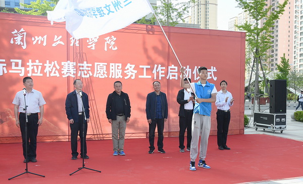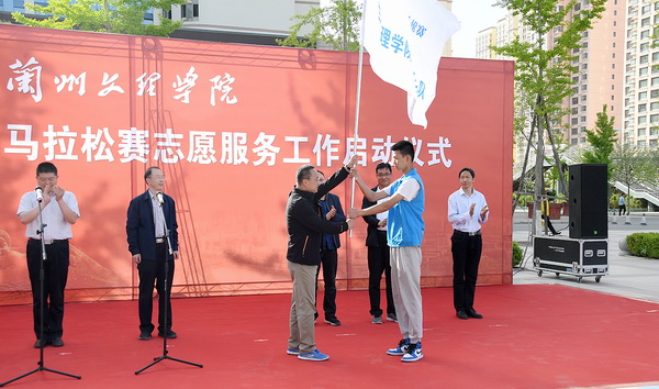 兰州市体育局调研员、兰州国际马拉松赛总指挥尚虎珊向2019兰州国际马拉松赛Beat365唯一官方网站志愿服务队授旗。