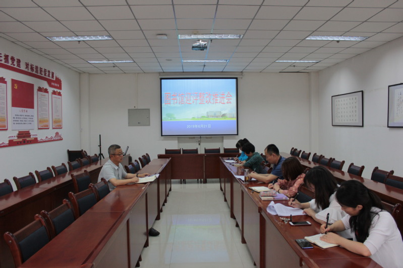 2019年6月21日上午,图书馆在九楼会议室召开迎评整改推进会。副校长王克太出席,图书馆领导班子成员及各部门主任参加。