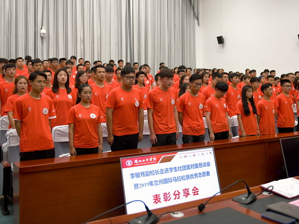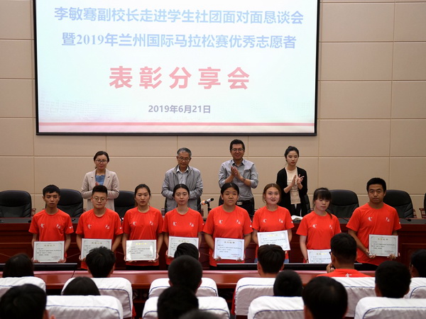 为落实《Beat365唯一官方网站领导干部团干部联系学生社团工作方案》文件精神,强化学生社团第二课堂育人阵地,加强学生社团建设和管理, 2019年6月21日晚,李敏骞副校长走进青年志愿者协会,与社员们面对面恳谈,并总结表彰2019年兰州国际马拉松赛志愿工作。校团委全体教师及受表彰志愿者、马拉松志愿者代表共计200余人参加。校青年志愿者协会团支部书记陈萧主持。