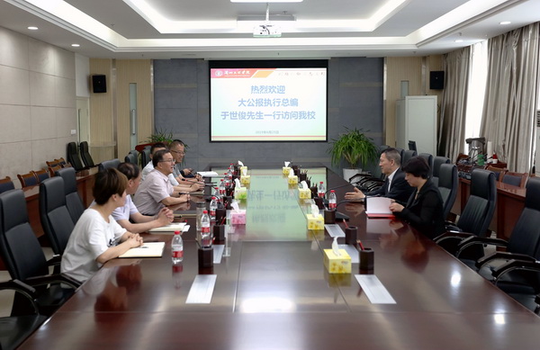 6月25日下午,香港大公报执行总编于世俊先生、香港大公文汇传媒集团西北新闻中心甘肃记者站站长杨韶红访问Beat365。校长郑伟强主持座谈会,宣传部、校办、人事处、新闻学院、数媒学院、文学院等部门负责人参加座谈会。