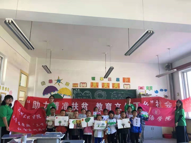 下午三时,队员武文凤、张弛进行了美术绘画教学,采用分组比赛的方式,指导学生独立完成作品且颁发小奖品。张弛和武文凤同学为明德小学绘制了教育扶贫文化墙,最后小分队为明德小学捐赠了图书以及文具,并和在校师生合影留念。