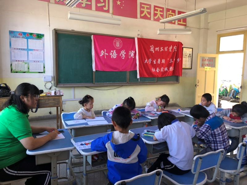 上午九时,队员杨兰兰、王莹雪对在校的小朋友进行了英语教学,通过教唱英文歌曲,做小游戏,奖品鼓励等方法调动了小朋友的积极性,效果显著。下午三时,队员武文凤、张弛进行了美术绘画教学,采用分组比赛的方式,指导学生独立完成作品且颁发小奖品。