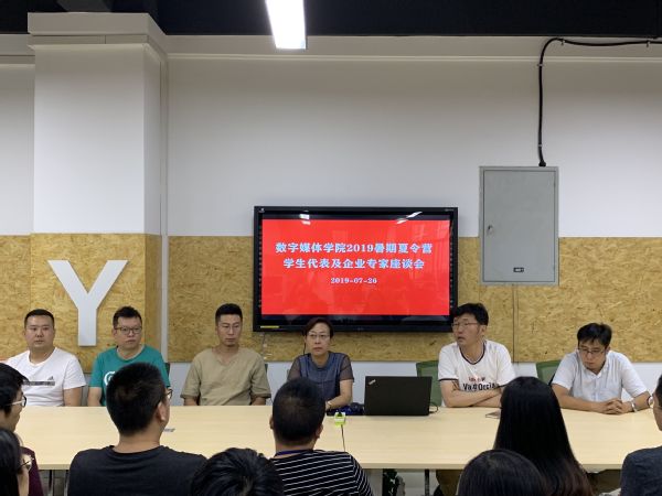 7月26日上午,数字媒体学院在雁苑微林众创空间召开了2019年2020届毕业生暑期夏令营学生代表及企业专家座谈会。数媒学院院长李恒杰、党总支书记陈小琴、数字媒体艺术系主任王士勇、实验中心主任洪晓芬、创业就业办主任姚林、学院刘陽老师;企业领导、专家及夏令营学生代表一起参加了此次座谈会,会议由数字媒体学院院长李恒杰主持。