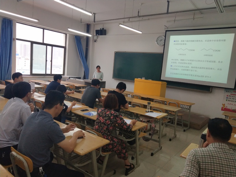 两个教研室几位老师分别进行了教学展示,王翼华老师生动的讲述了“羧酸及其衍生物”,主要介绍了羧酸的结构、分类、命名及其制备方法;牛腾老师就有机合成中的“重排反应”进行了介绍,语言生动有趣,并将思政元素融入了教学过程;张鸿波老师通过课程学情介绍,前情回顾,介绍了“过渡金属有机配合物对小分子的活化”;雷芸老师用抑扬顿挫的语调、精美的PPT、严谨的板书向大家介绍了“三羧酸循环”。