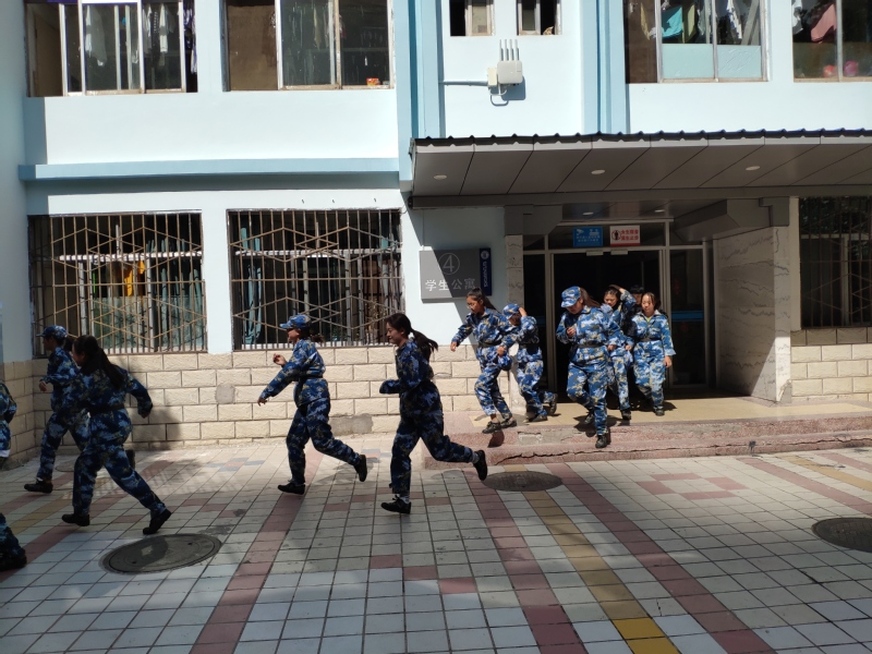 9月17日下午,由演练指挥魏建明同志宣布准时开始。假设接到地震疏散预警,保卫处接报后,立即通知各相关部门启动突发事故应急处置预案,各应急小组成员迅速赶赴北校区4号、6号、11号学生公寓现场。公寓值班人员快速打开安全疏散通道,向楼内学生发出疏散警报。各楼层保卫处、学生处、辅导员和军训教官第一时间到达各自预定执勤岗位就位,在宿舍各楼道、楼梯位置做疏散指挥工作。听到疏散警报后,同学们迅速离开宿舍,按照安全转移路线和要求,用手臂保护头颈部,低身有序撤离危险区域并在安全位置集合。在集合点,疏散人员根据军训区队划分集合整队,清点人数并报告,确保全体同学均已安全转移,并向演练总指挥汇报。