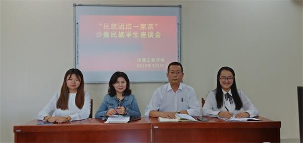 为进一步加强与少数民族学生的沟通和交流,全面了解少数民族学生在校的学习、生活情况,不断推进和谐美好的校园建设,2019年9月30日中午,传媒工程学院在学院会议室举办庆祝新中国成立70周年“民族团结一家亲”少数民族学生座谈会。学院党总支书记宁学君、副院长杜萍、辅导员朱春艳、李珂、邵盈鑫及学院少数民族同学共40余人参加了本次座谈会。