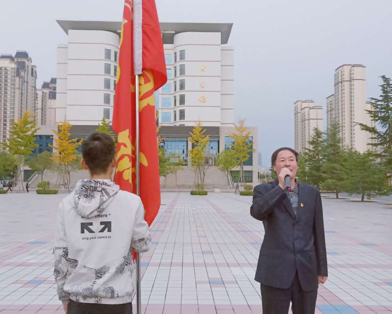 嘹亮歌声响彻清晨,飘扬国旗尽展风采。升旗仪式开始,首先由国旗护卫队护送国旗至升旗台。当国歌奏响,在场全体师生高唱国歌,面向国旗行注目礼,全体人员庄重肃立,目视国旗在朝阳的照耀下冉冉升起。