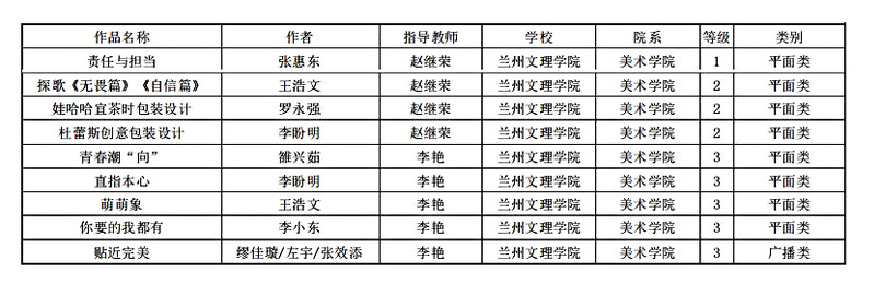 在刚刚落幕的第十一届全国大学生广告艺术大赛中获悉,我院教师指导学生作品共获得全国赛区二等奖1项,优秀奖1项,甘肃赛区一等奖1项,二等奖3项,三等奖5项。本届大赛甘肃分赛区共有38所高校的3758件作品最终参加了竞赛。