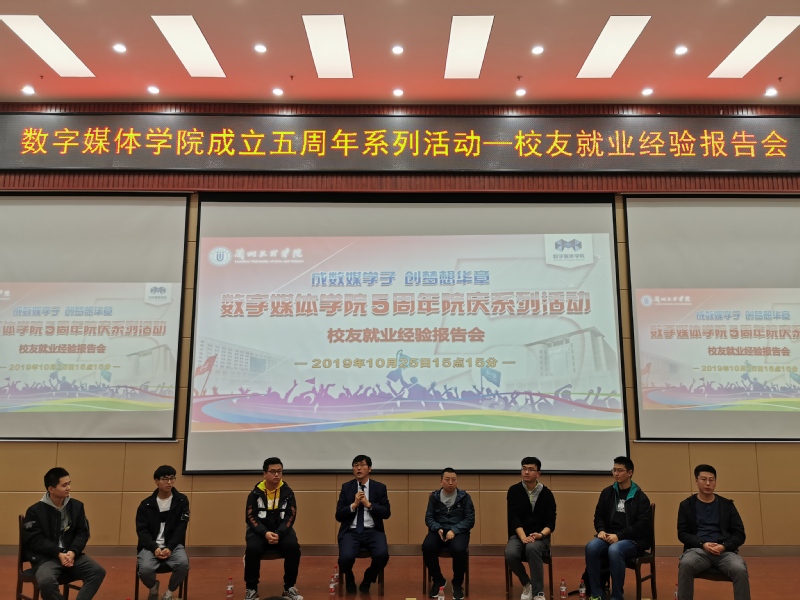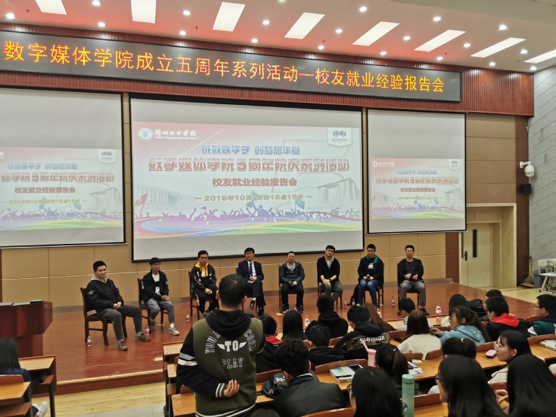 10月25日下午,数字媒体学院成立五周年系列活动——校友就业经验报告会,在Beat3655-205教室成功举行,数字媒体学院2018届、2019届优秀毕业生代表王虎、何瑜、郭晓春、盖海龙、范伟、王旭等参加此次活动,数字媒体学院院长李恒杰教授、院创业就业办主任姚林、数字媒体学院全体学生干部、舍长参加此次活动。会议由学院院长李恒杰教授主持,学院230多名同学参加了交流会。