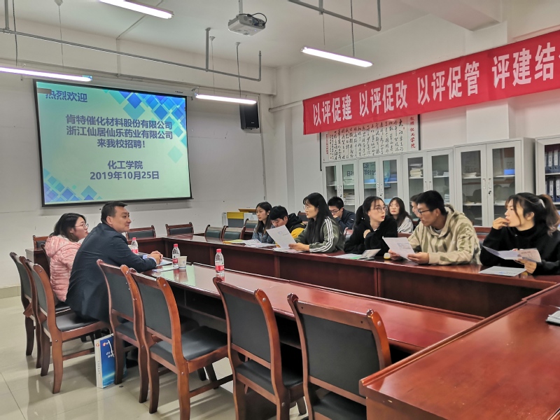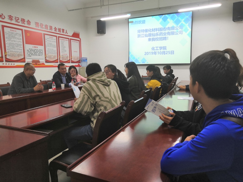 10月25日,浙江肯特催化材料股份有限公司和浙江仙居仙乐药业有限公司来我院开展校园招聘,招聘会在学院会议室举行,16级本科生参加了本次招聘。