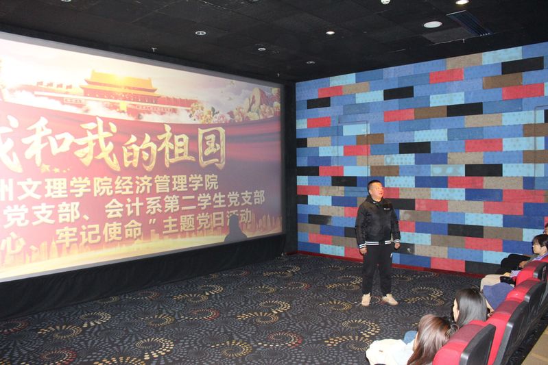 10月30日晚,由金融系学生党支部和会计系第二学生党支部共同组织《我和我的祖国》观影活动在97国际电影城顺利举行,60名党员和党员发展对象、入党积极分子代表齐聚一堂,鲜艳的中国红背景将现场点缀得流光溢彩,暖意融融。经济管理学院党总支书记王迎春、副书记副院长赵宁、金融系学生党支部书记于洋、会计系第二学生党支部书记刘宁一、辅导员张小花老师、贾欢欢老师参加活动。