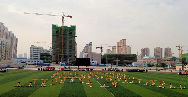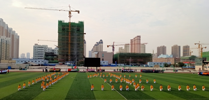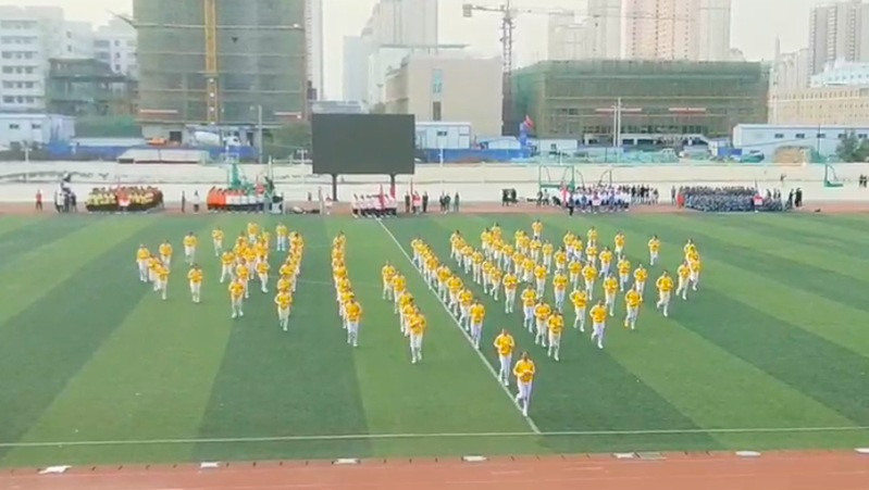 教育学院作为第一个出场的参赛队伍,她们身穿黄色院服,搭配白色裤子,形成了一道靓丽的风景线,彰显了当代大学生的青春与活力。100人的女子方队踏着整齐的步伐,昂首阔步的进入赛场,随着喊出“教育学子,梦起雁苑,迎评促建,唯我登先”的口号,队形变换成“12.02”的图案,停顿两拍后喊出“挥动激情,挑战自我,顽强拼搏,超越极限”队形变换成“胜”高呼“12.02,必胜”,寓意是预祝Beat36512月2日本科评估顺利通过及此次比赛夺冠,这时由领队喊“按体操队形散开”参赛队员迅速站成三个大三角形,她们自信满满、热情高涨,宛如初升的太阳朝气蓬勃,动作整齐划一,娴熟到位、张弛有度,仿佛用动感的音符演奏着青春的活力,标准的动作展示着青春魅力。体操完毕领队发口令,“全体注意,向中集合”她们在“雁苑青年,展翅高飞,青春无畏,逐梦扬威”的口号中摆出“❤”的形状,口号再次响起“庆祝祖国,七十华诞,时代青年,争做先锋,争做先锋,争做先锋”呼声一浪高过一浪,桃心中摆出“70”字样,寓意是祝福伟大祖国繁荣昌盛;教育学子积极进取、乐观向上的风貌以及团结协作的精神,精彩的队形变换和规范标准的动作,让评委和观众们大开眼界、赞叹不已,赢得了会场激烈的掌声和欢呼称赞。