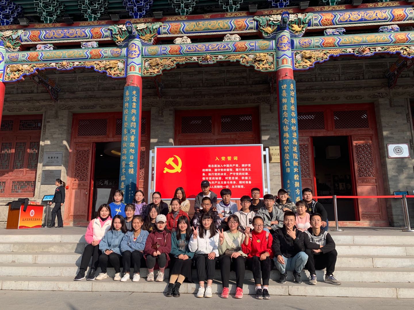 在参观学习的过程中,师生代表们在入党誓词前合影留念,感受党旗的庄严,也激励学生努力成为一名优秀的共产党员。通过倾听革命先辈们的光荣事迹,激发学生的爱国热情和奋斗精神。