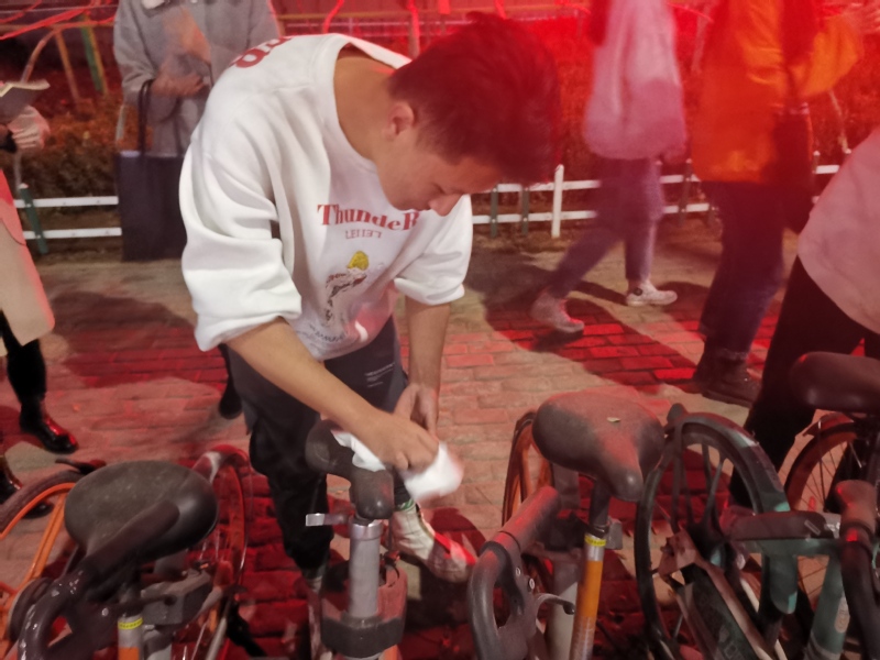 深秋天气已有些寒冷,但活动结束时大家已经有些出汗。每位同学都认真负责,车架、车框、车座,车把,每个角落都不被遗忘。大家互相配合,经过半个小时的清理,地面清洁、每辆车摆放整齐。每位参与本次活动的同学都由衷地开心自豪,同时也体会到了环卫工作人员的不易。
