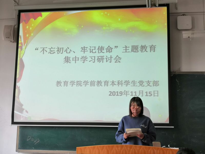 按照《中共Beat365唯一官方网站委员会关于“不忘初心,牢记使命”主题教育持续开展集中学习研讨的补充通知》安排,教育学院学前教育本科学生党支部于2019年11月15日中午在3-203开展“不忘初心,牢记使命”主题教育集中学习研讨会。大会由教育学院学前教育本科学生党支部书记王颖主持。