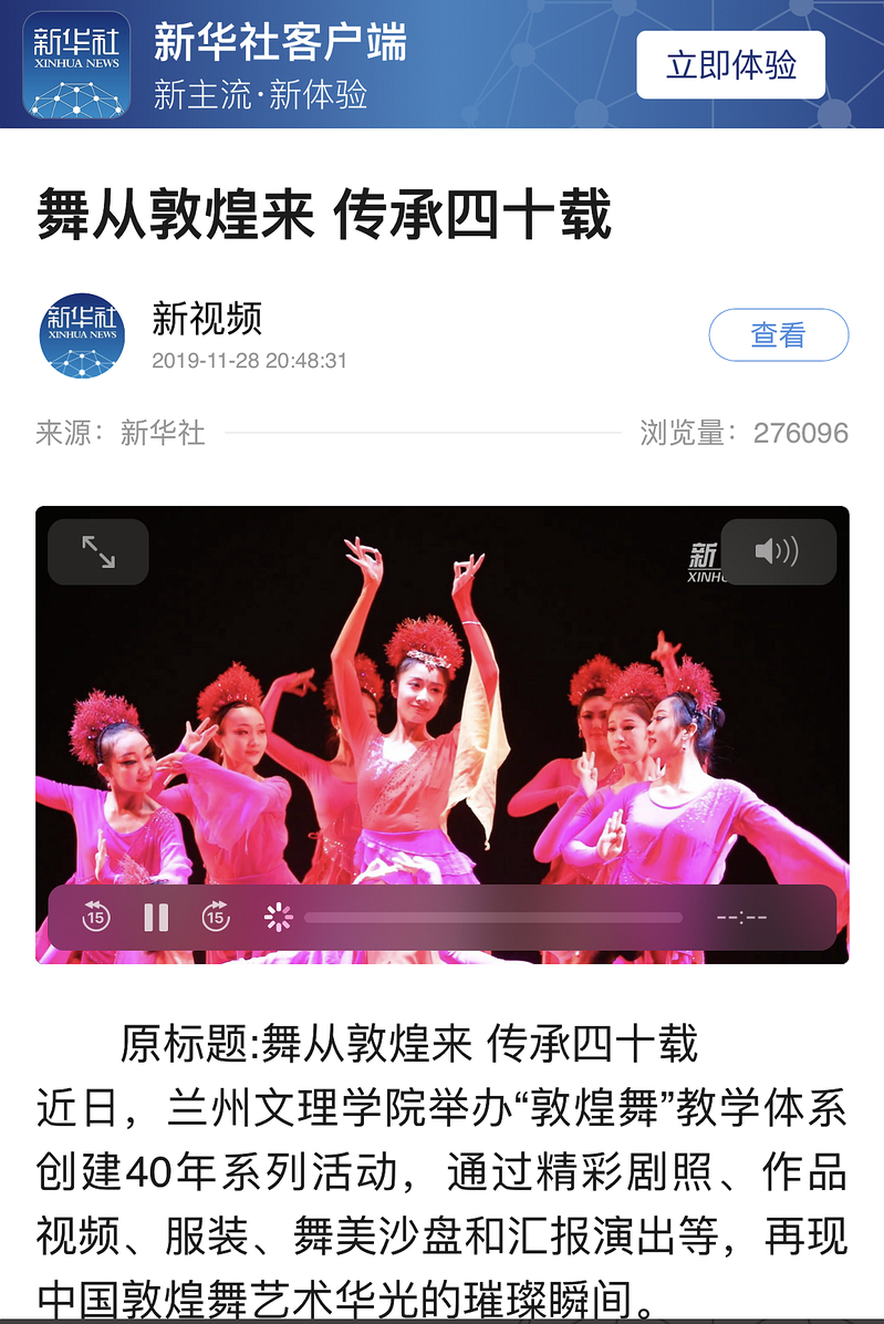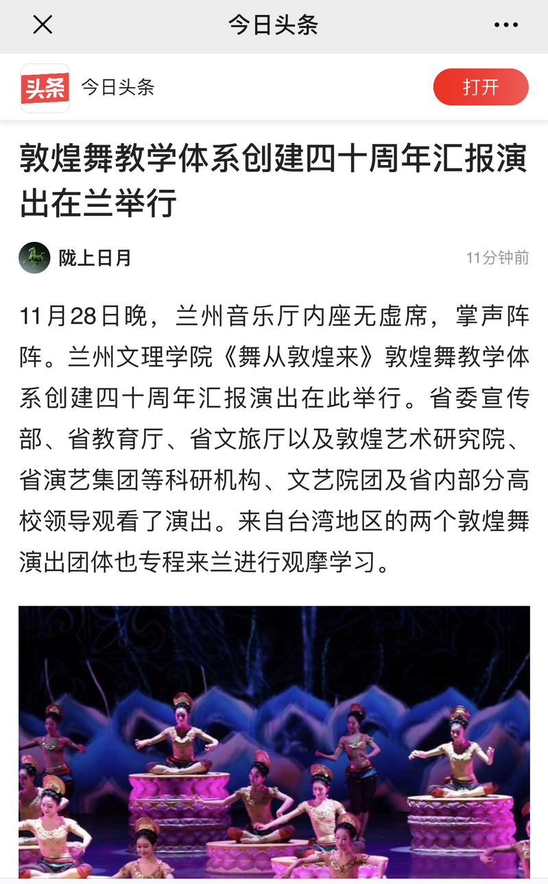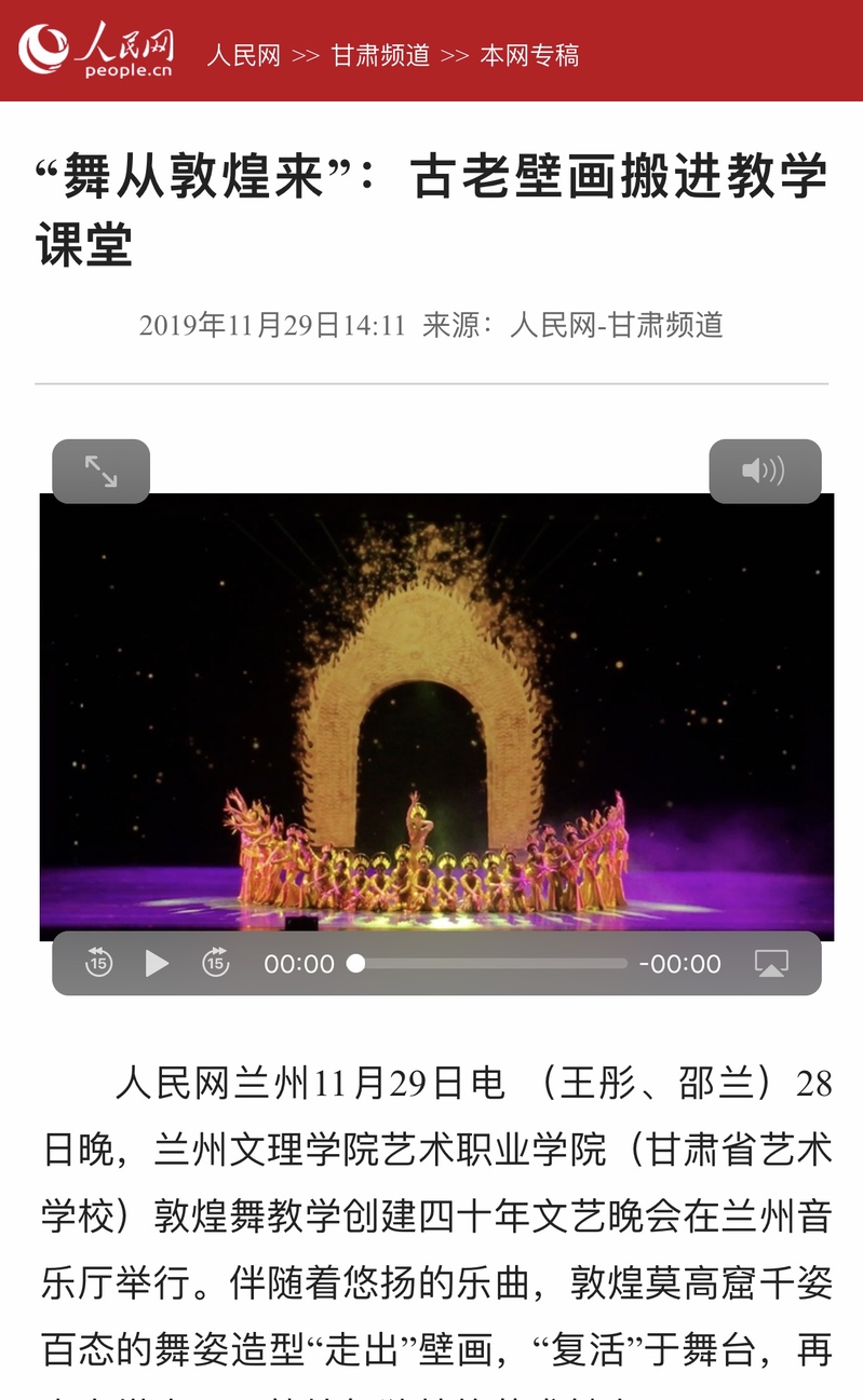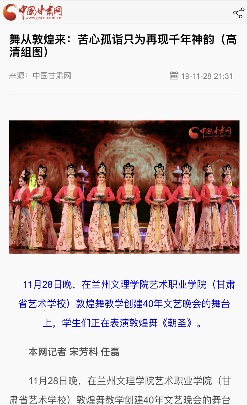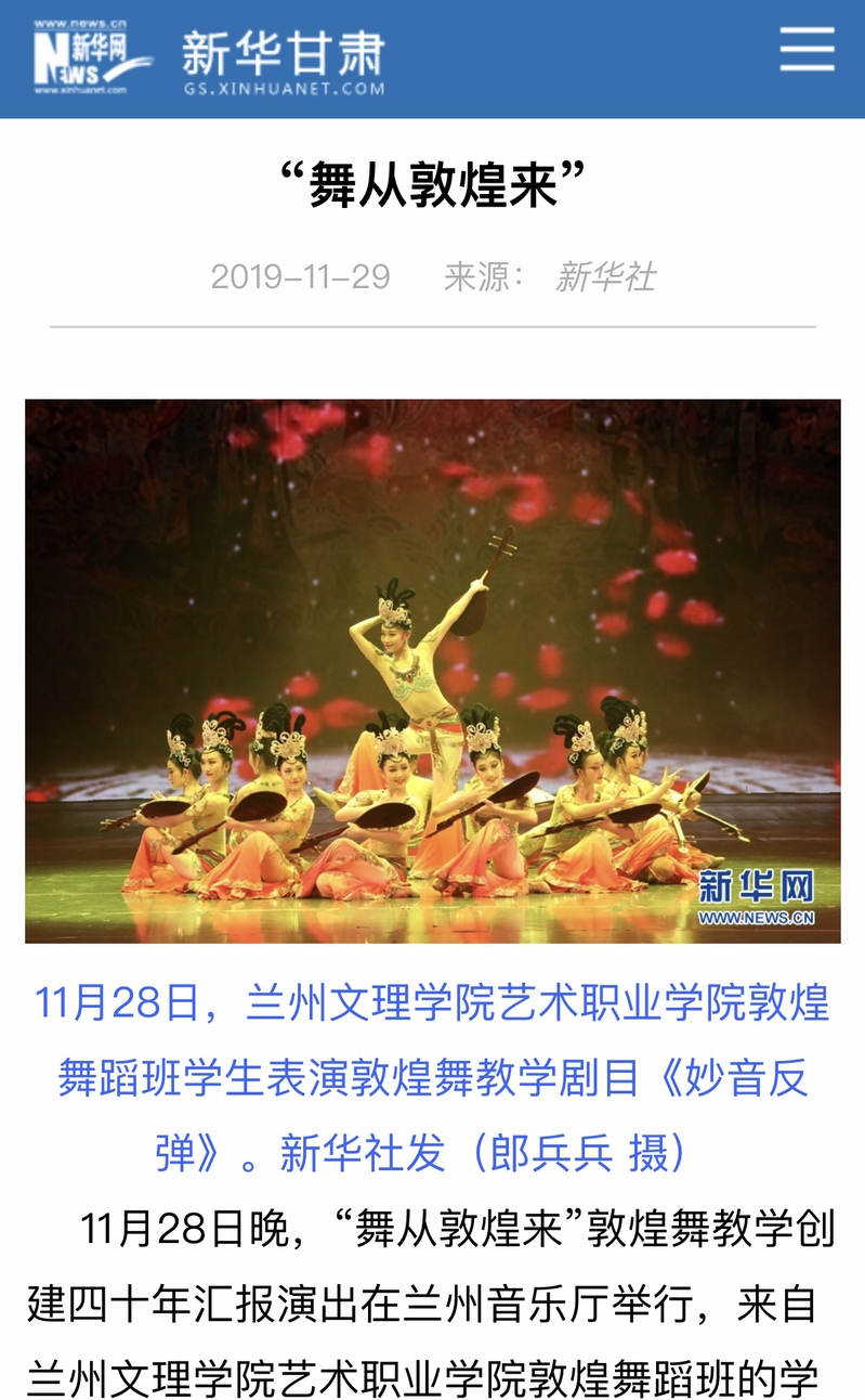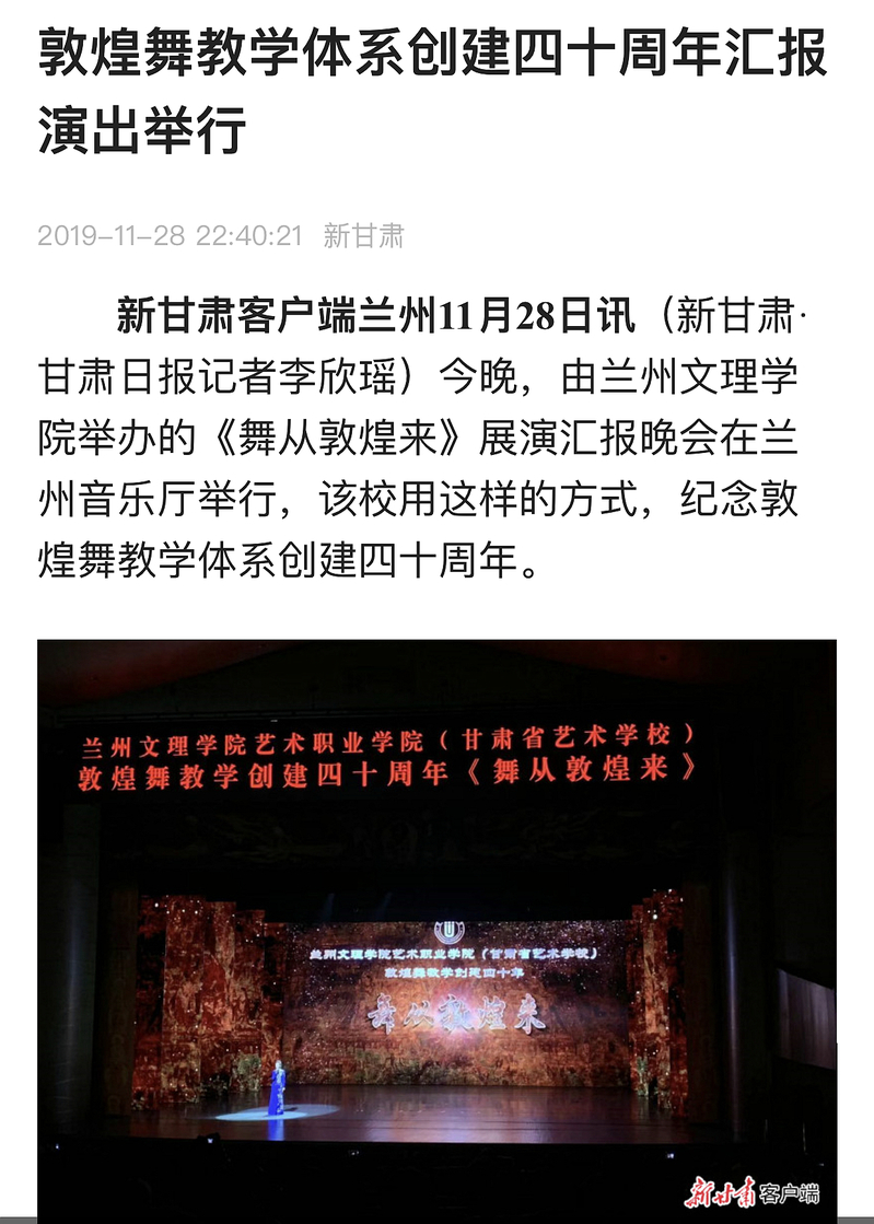 2019年11月28日,Beat365唯一官方网站在兰州音乐厅成功举办了敦煌舞教学体系创建40周年《舞从敦煌来》展演汇报晚会。多家主流媒体予以报道。