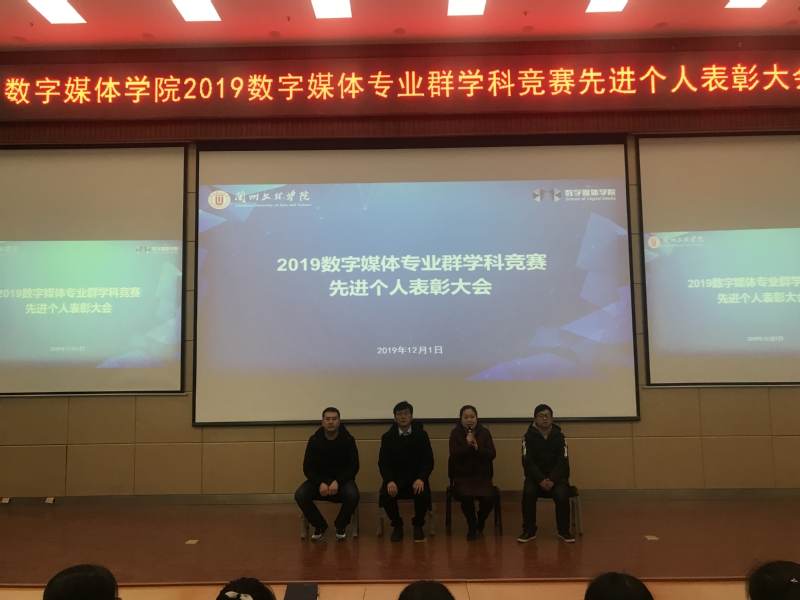 会议开始,首先宣读了2019年度数字媒体专业群获奖学生的名单,并为他们颁发了荣誉奖牌。由获奖作品的第一作者依次播放了自己的作品视频并发表了获奖感言,他们代表自己的团队表达了对学校及老师们的感激。获奖同学从赛前准备、团队合作、答辩等多个方面进行了经验分享。使我院18、19级数字媒体技术和数字媒体艺术的学生增加了学习兴趣,提升了竞赛的热情。