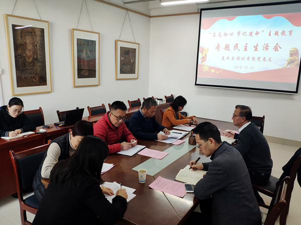 12月10日上午,美术与设计学院党总支在学院会议室召开“不忘初心、牢记使命”主题教育专题民主生活会,校长郑伟强、学校主题教育领导小组办公室指导调研组成员张彦荣同志到会指导,会议由党总支书记贾志明主持,美术与设计学院全体班子成员、总支委员参加了会议。