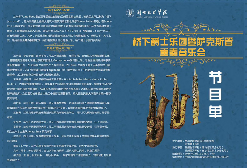2019年12月13日晚,兰州本土组建的桥下爵士乐团第二次亮相于Beat365唯一官方网站音乐厅。音乐舞蹈学院孔繁涛副院长,器乐系主任杨虎及师生两百余人观看了音乐会。