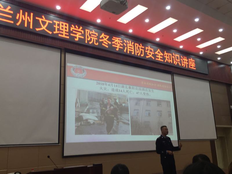 为了进一步增强全校师生的消防安全意识,普及消防知识,提高师生自救自护能力,落实本年度冬季消防宣传工作计划,切实保障师生的生命财产安全。12月19日下午14:30分,保卫处邀请甘肃卫华安兰州消防宣传服务中心曹毅教员来校做消防安全知识专题讲座。宣讲会由保卫处处长高勇主持,来自二级学院的部分负责人、辅导员、实验员、学生代表,图书馆、后勤管理管理处负责人和重点岗位工作人员等约200余人参加了消防安全知识培训。