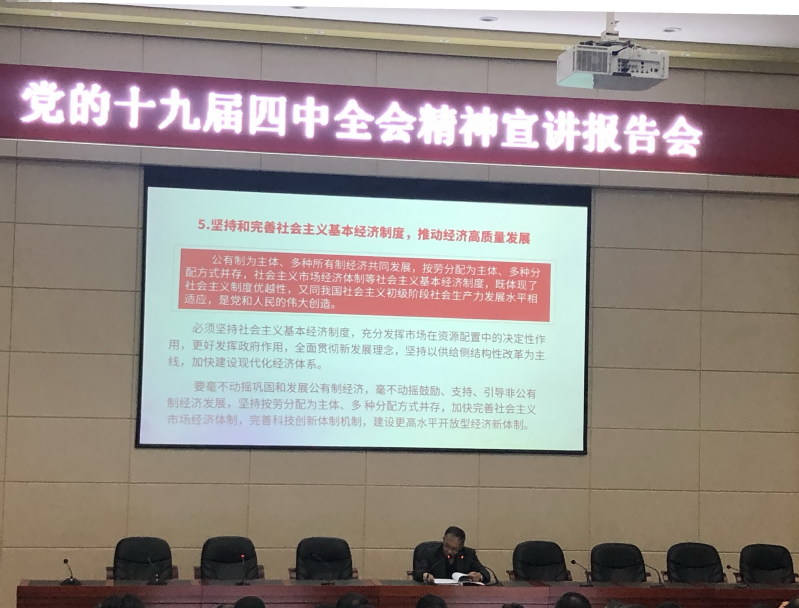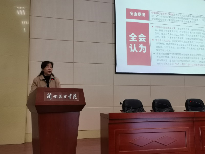 12月19日中午,学习贯彻党的十九届四中全会精神宣讲报告会在学术报告厅举行,学校宣讲团成员李敏骞副校长、马克思主义学院孙红英教授分别作宣讲报告。