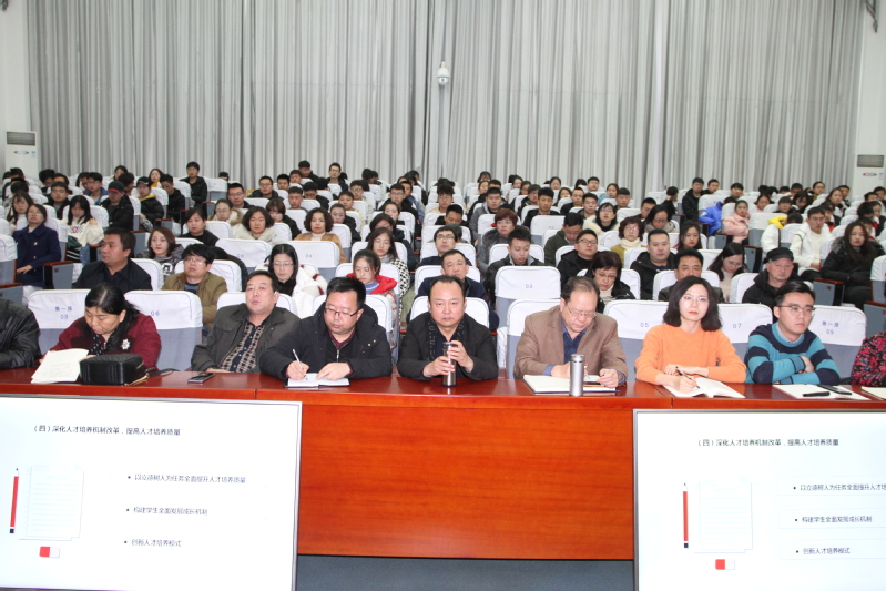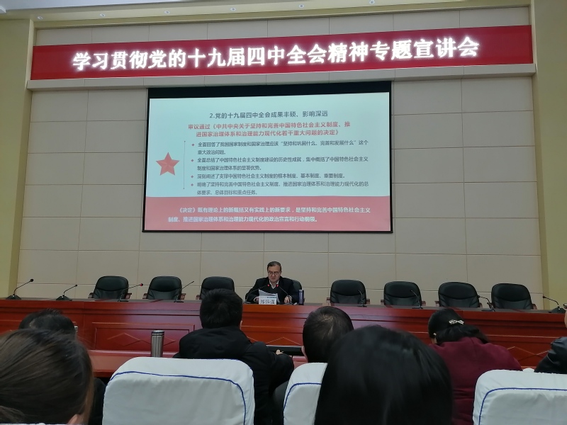 首先,郑伟强校长紧紧围绕党的十九届四中全会主题、我国国家制度和国家治理体系的显著优势、推进国家治理体系和治理能力现代化的时间表和路线图、中国特色社会主义制度的图谱等4个方面宣讲了党的十九届四中全会精神;随后,郑校长就深入学习贯彻十九届四中全会精神,努力提升学校治理能力和治理水平从:坚持党对学校工作的全面领导;深化内部管理体制改革,完善现代大学制度体系;深化人事管理制度改革,打造高素质的人才队伍;深化人才培养机制改革,提高人才培养质量;深化科研管理体制机制改革,提升科研能力和水平;构建师生员工荣誉体系,激发师生员工干事创业热情六个方面做了全面阐述。
