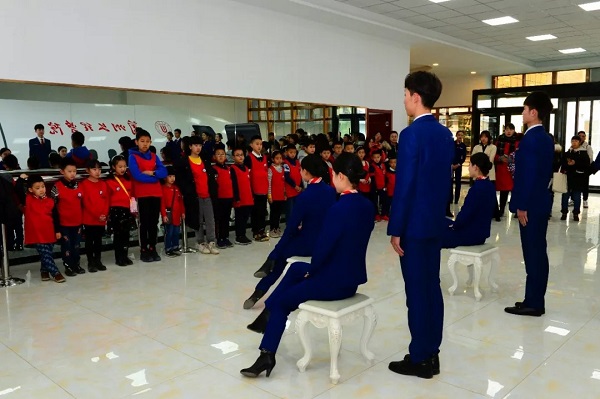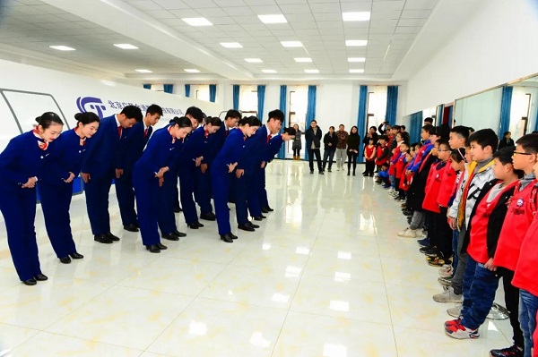 “小小空中乘务员”分成4组参观了GBT教学教研室、化妆教室、航空科普厅和科技模拟舱内部。期间,旅游学院空乘专业的学生为“小小空中乘务员”展示了“一度鞠躬 ”、“二度鞠躬”、蹲姿训练、坐姿训练、指示手势等基本日常训练。空乘专业对空姐佩戴丝巾的叠法、妆容的标准,甚至细致到口红的颜色都是有要求的,对空少们的要求略微宽松些,仅仅是规定了发型的长度。“小小空中乘务员们”在我院空乘专业学生们的礼仪表演中了解了基本的姿势和动作,经过短短半小时的学习,孩子们有模有样地为大家做了展示。