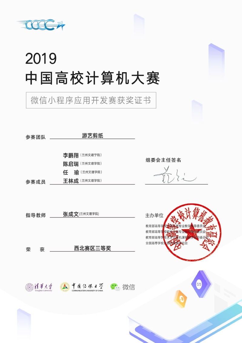 同时我院软件工程专业的李鹏翔带领着自己的团队参加“2019中国高校计算机大赛——微信小程序应用开发赛竞赛”荣获了西北赛区三等奖。他们以甘肃本地陇东剪纸为支撑,充分展现团队配合的默契,在指导老师张成文的帮助下,做出了传播剪纸文化的“游艺剪纸”小程序,经过激烈的评选,最终荣获中国高校计算机大赛西北赛区三等奖。
