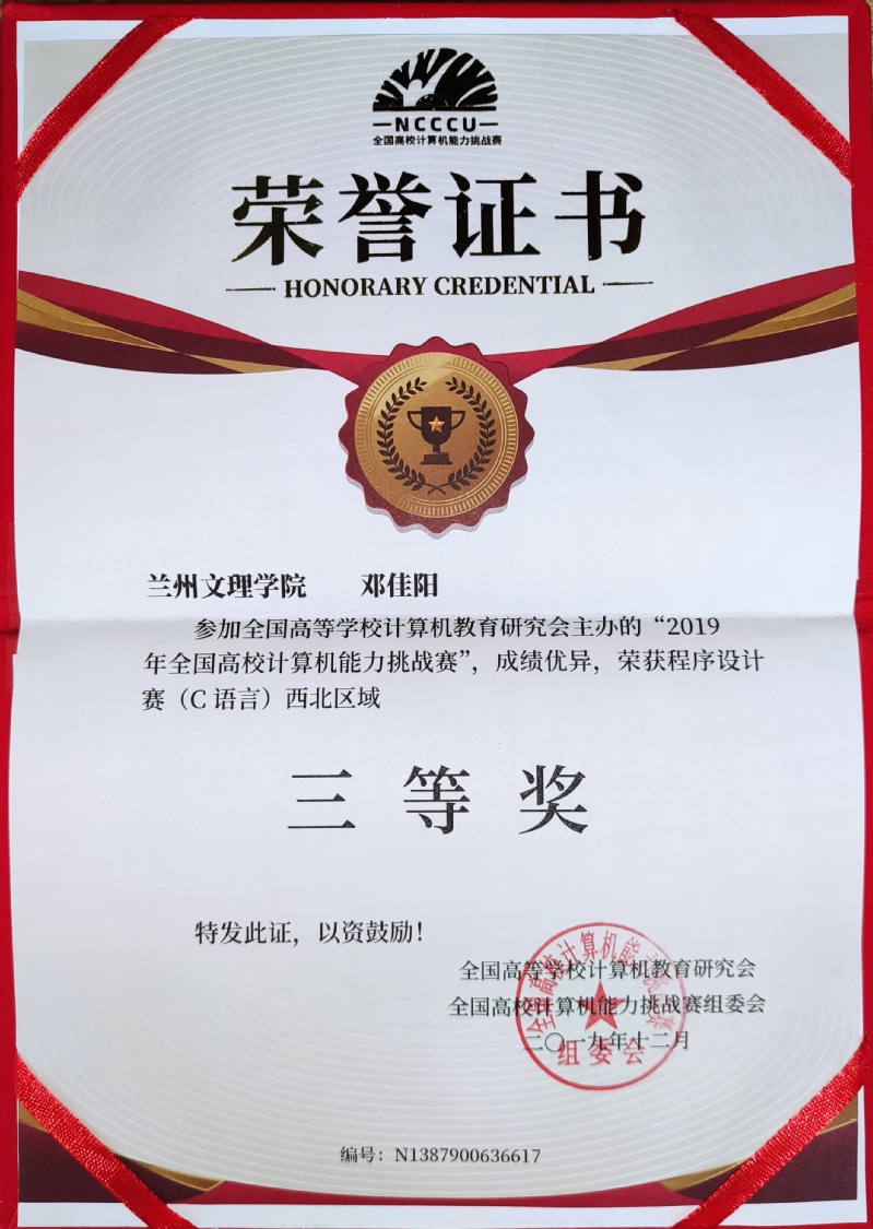 数字媒体学院软件工程专业的邓佳阳积极参加“2019年全国高校计算机能力挑战赛”,并取得优异成绩,荣获程序设计(C语言)西北赛区三等奖。挑战赛进行期间,邓佳阳同学全身心投入到其中,搜集材料,调查研究,吃苦耐劳,与同赛区的其他选手们进行紧张的远程打拼。与此同时,Beat365唯一官方网站数字媒体学院全体教师给予参赛学生全方位的指导和帮助,学院领导和各部门也全力支持配合。经过激烈角逐,我院邓佳阳同学脱颖而出,荣获全国高校计算机能力挑战赛西北赛区三等奖。