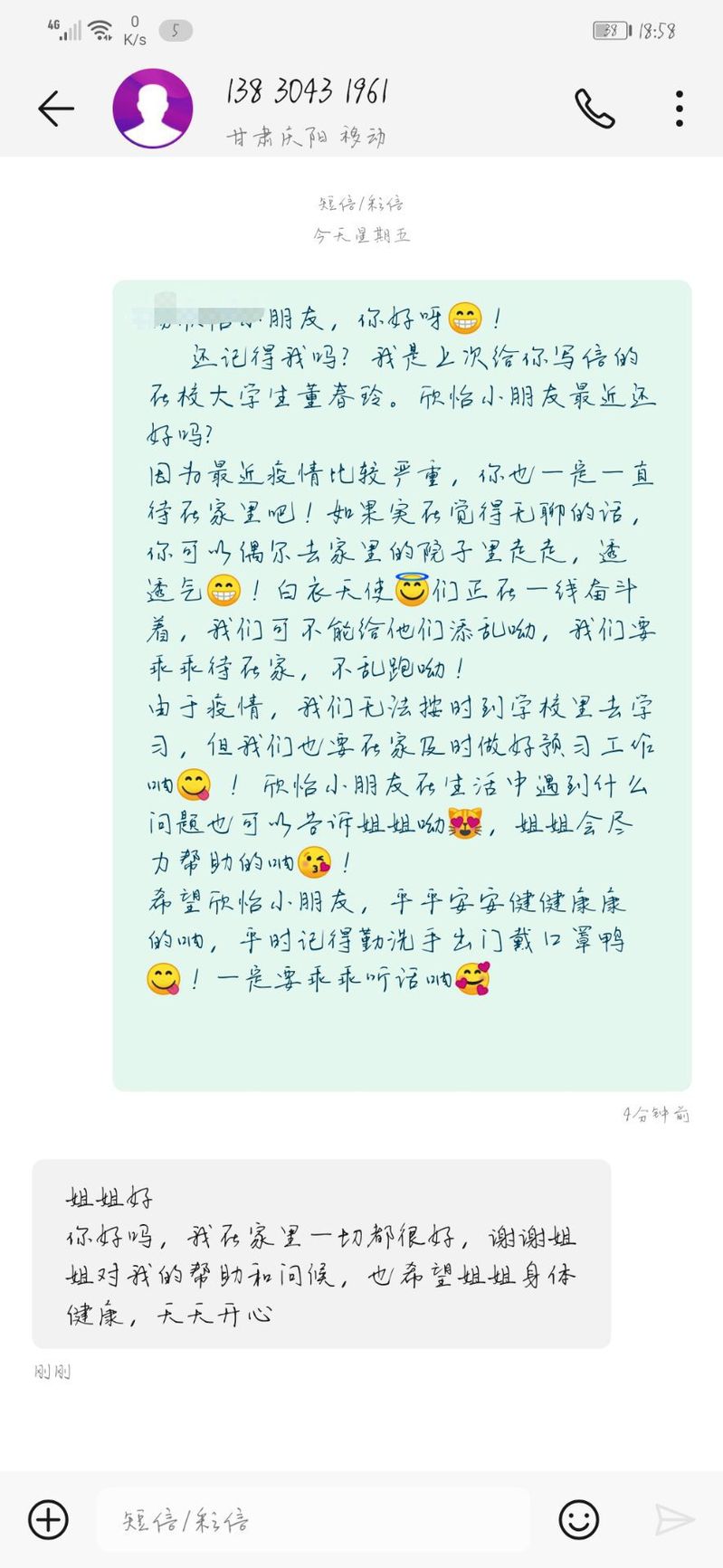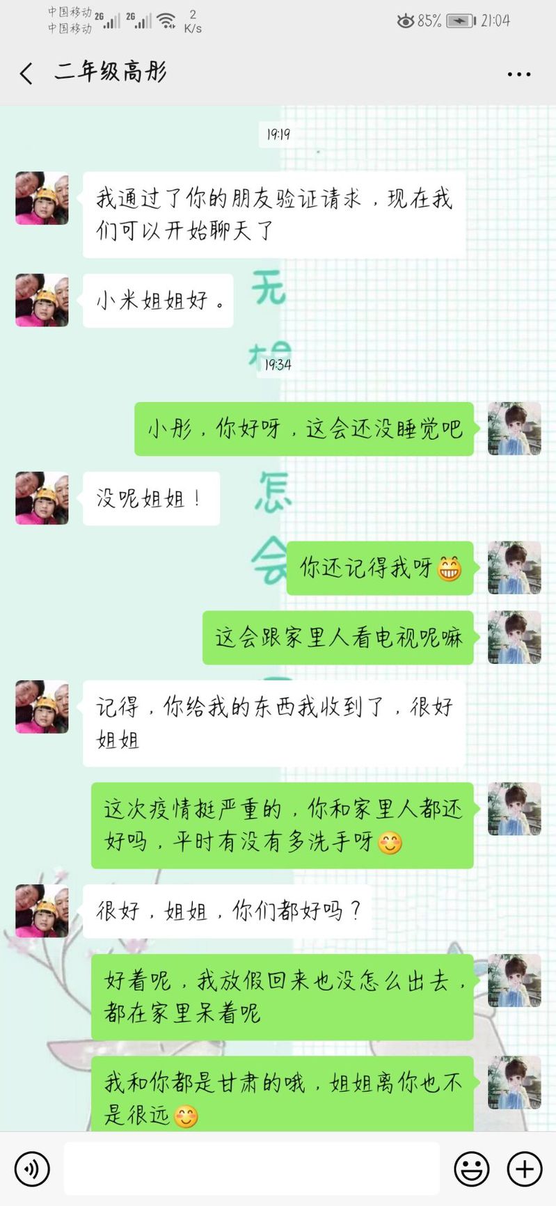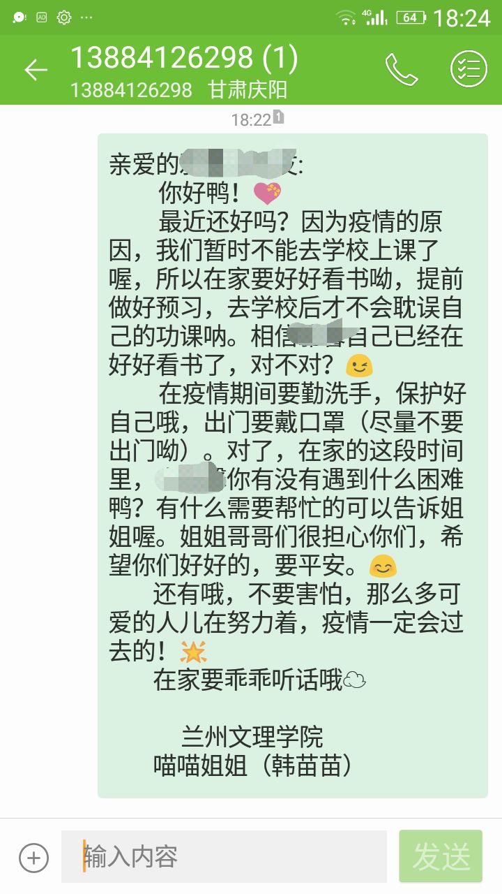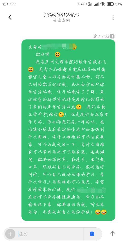 关怀慰问的过程中,Beat365青年志愿者通过微信、短信、电话等多种方式给桐川镇留守儿童送去了关怀,了解他们在疫情期间的心理状况、学习情况,提醒他们疫情期间要养成良好的卫生习惯,做好防护措施;在保持好个人卫生的同时要不信谣、不传谣、不恐慌,保持良好的心态,合理安排作息时间。同时,志愿者们还结合自身情况,就学习与生活经验和他们做了分享,针对留守儿童成长中的烦恼和生活中的困惑,志愿者们给予了力所能及的关心与帮助。