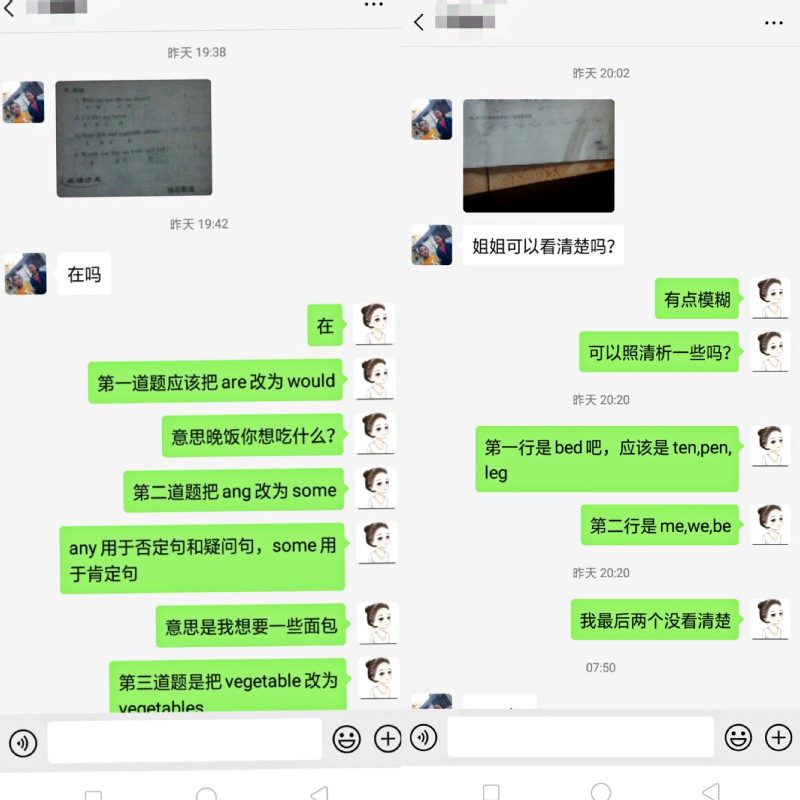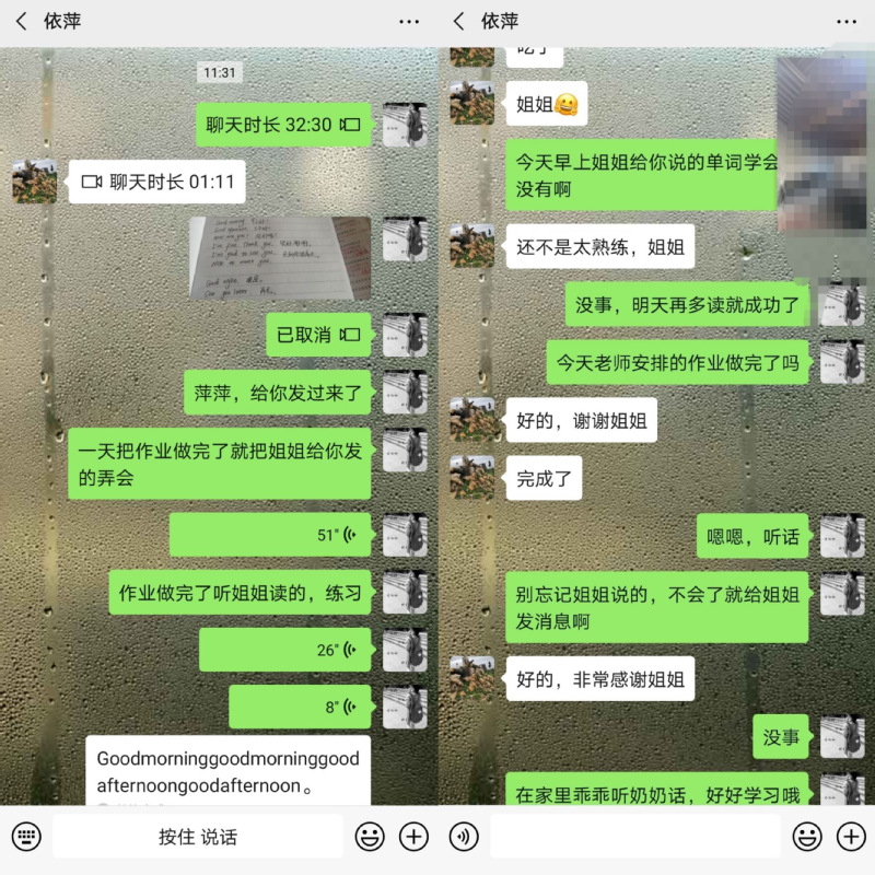 线上助学过程中,Beat365青年志愿者通过微信、短信等多种方式了解结对留守儿童近期的学习情况,热心询问他们线上学习过程中存在的困难和问题,并对孩子们的求助的课业问题进行及时、耐心的回复和解答。针对孩子们求助较多的英语学习问题,志愿者们借助微信视频、语音等功能,通过志愿者本人朗读示范,指导孩子们的发音,并对孩子们作业中存在的语法、单词拼写等问题予以纠正。还有的志愿者向孩子们推荐了手机APP在线学习工具,帮助孩子们更高效地解决英语学习中遇到的单词发音与释义问题。