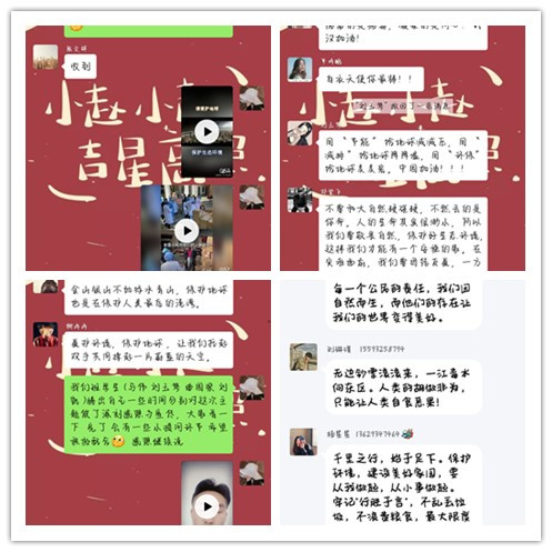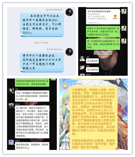 此外,新闻传播学院18级播音与主持艺术2班、旅游学院17级旅游管理专升本班、数字媒体学院18级数字媒体3班、马克思主义学院19级思想政治教育班、经济管理学院2018级财务管理2班、音乐舞蹈学院19级音乐表演3班、社会体育学院2018级社会体育指导与管理班等班级团支部围绕对此次疫情的看法,病毒的传播途径及防疫措施、野生动物与新型冠状病毒之间的关系、保护野生动物及生态环境的重要意义、如何参与野生动物与生态环境保护等话题展开线上讨论,支部成员积极参与,取得了良好的效果。