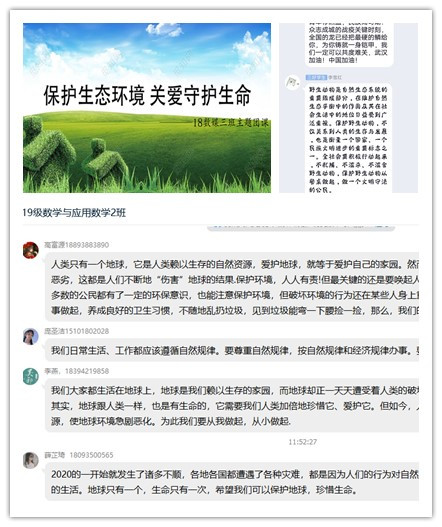 为深入学习贯彻习近平总书记对新冠肺炎疫情系列重要指示精神和党中央、国务院决策部署,按照团省委和学校党委相关工作要求,有效发挥共青团组织动员和宣传优势,倡导“关爱自然、关爱社会、关爱他人、关爱生命”的理念,为争取疫情防控斗争胜利贡献青春力量。近日,在校团委的倡导和组织下,全校各级团组织、团员青年围绕“保护生态环境·关爱守护生命”这一主题,通过微信、QQ、钉钉等网络社交平台,开展了丰富多彩的线上主题团日活动。