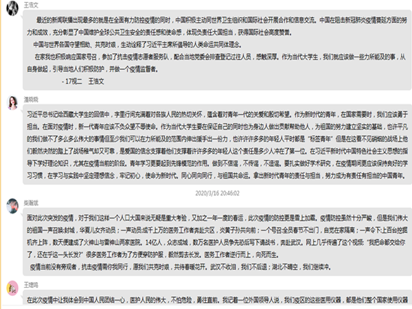 最后,大家在群里发起为武汉加油、中国加油的活动,分享在特殊时期自己的所思所想,互相鼓励,以爱和信心传递正能量。