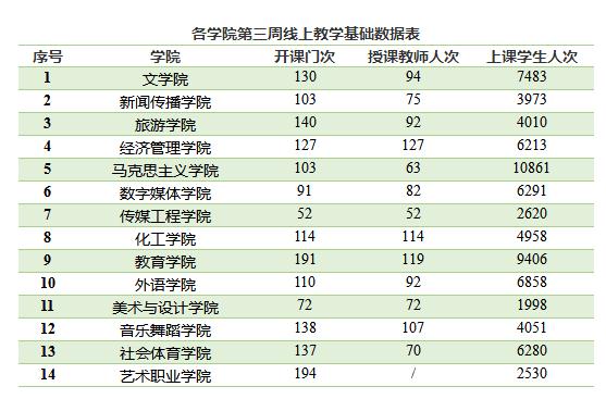 线上教学第二、三周,学校共开设1702门次在线课程,累计2257人次教师参与在线授课、148836人次学生参与在线学习,教师授课率为100%,学生出勤率为99.69%。第二、三周线上课程全部按时开出。
