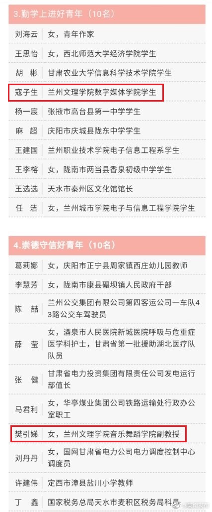 2020年“甘肃省向上向善好青年”名单(部分)