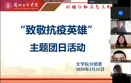 以“静”致敬,英雄可敬。2020年3月31日中午12:00,由文学院分团委组织的致敬抗疫英雄主题团日活动在腾讯会议准时召开。文学院18、19级各班团支书以及组织部、宣传部全体成员参加此次会议。会议由分团委副书记吕超超主持进行。会议旨在阐述“致敬抗疫英雄,提高防范警惕”的主题思想。