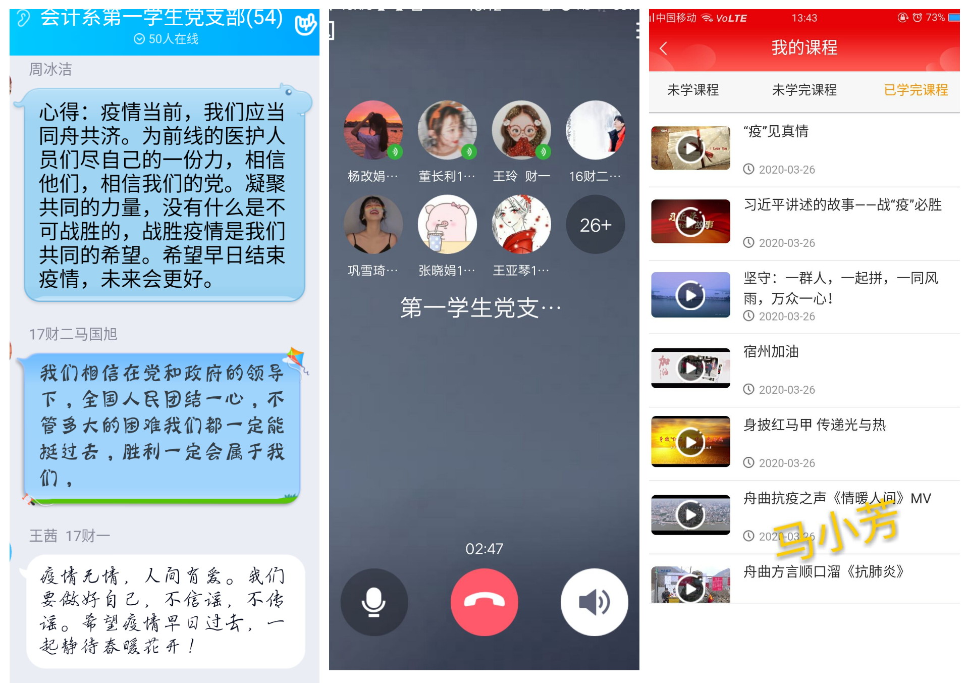 在党课学习交流会议上,支部书记董滢向全体党员介绍本次党课的学习内容,要求学生党员们认真学习党课内容,并通过QQ群积极发言交流,谈谈自己本次党课的学习心得,党员同志们争先发表自己的看法,交流本次防疫党课学习心得。此外,会计系第一学生党支部响应广大党员在疫情防控中的先锋模范带头作用,积极开展爱心捐款活动,各位学生党员纷纷伸出了援助之手,27名党员共捐款1350元,体现了新时代学生党员的良好素养。