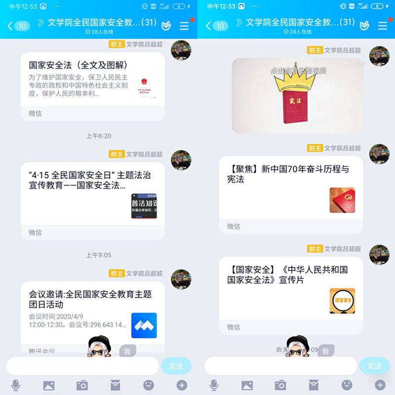2020年4月9日中午,文学院分团委召开国家安全教育日的线上会议。贯彻落实“全民国家安全教育日”主题宣传教育活动,做好疫情期间学生安全防护教育,不断增强学生国家安全意识,提高学生维护国家安全的法律意识。