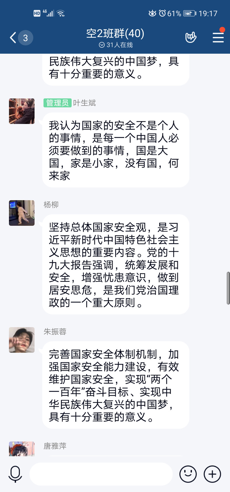 旅游学院各班围绕“国家安全”主题展开交流讨论,17级旅游管理专升本班、18级旅游管理民航服务班、19级空中乘务3班等班级同学观看了国家安全宣传视频,并写下心得体会。
