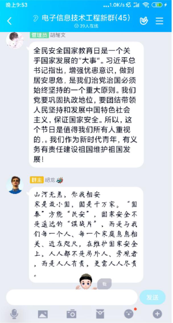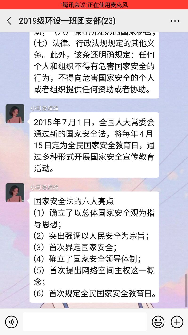 传媒工程学院18、19级各班团支部书记在线上利用以观看视频、分享身边人的励志故事等形式,为同学们生动普及了全民国家安全教育日的相关知识。