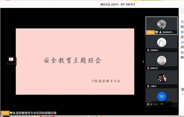 活动开始,各班围绕“国家安全”主题畅所欲言并开始讨论,17级旅游管理一班同学在发言中强调国家安全是安邦定国的重要基石,维护国家安全是人民根本利益之所在。广大群众要切实增强主人翁意识,自觉学习国家安全知识,积极为维护国家安全贡献智慧和力量。任何个人和组织不得有危害国家安全的行为,不得向危害国家安全的个人或者组织提供任何资助或协助。18级酒店管理班同学提到国家安全是国家发展的最重要基石、人民福祉的最根本保障。从“利莫大于治,害莫大于乱”的古训,到今天一些国家和地区深陷战火和苦难,再到恐怖主义带来的巨大危害,都在告诉我们,没有安全的基础、稳定的环境,什么都搞不成。而我们要牢固树立国家安全意识,从我做起。19级旅游管理民航服务班同学认为国家安全不仅关乎国家的兴亡,还关乎每个公民的切身利益;维护好了国家安全,既能保护国家利益,也能保护个体利益,而一旦国家安全受损,我们就有可能付出巨大的代价。维护国家安全,是为了维护最广大人民的根本利益;维护国家安全,也需要发挥每个公民的力量,打一场“人民战争”。国家安全法确立全民国家安全教育日,其中最重要的实践意义,就是要动员政府和全社会共同参与到维护国家安全的各项工作中来。活动最后由各班团支书发言,他们在提到国家安全时说道,“安而不忘危,存而不忘亡,治而不忘乱。”统筹发展和安全,增强忧患意识,做到居安思危,是我们党治国理政的一个重大原则。党的十九大把坚持总体国家安全观作为新时代坚持和发展中国特色社会主义的基本方略之一,明确要求必须坚持国家利益至上,以人民安全为宗旨,以政治安全为根本,统筹外部安全和内部安全、国土安全和国民安全、传统安全和非传统安全、自身安全和共同安全,完善国家安全制度体系,加强国家安全能力建设,坚决维护国家主权、安全、发展利益。