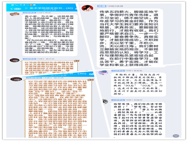 同学们结合老师的发言在群里发表个人感受,他们一致认为传承五四精神是所有青年人义不容辞的责任和任务,应加倍珍惜伟大时代赋予的一切,脚踏实地、尽职尽责承担社会责任,以实际行动践行入团誓言,展现青春之蓬勃力量。