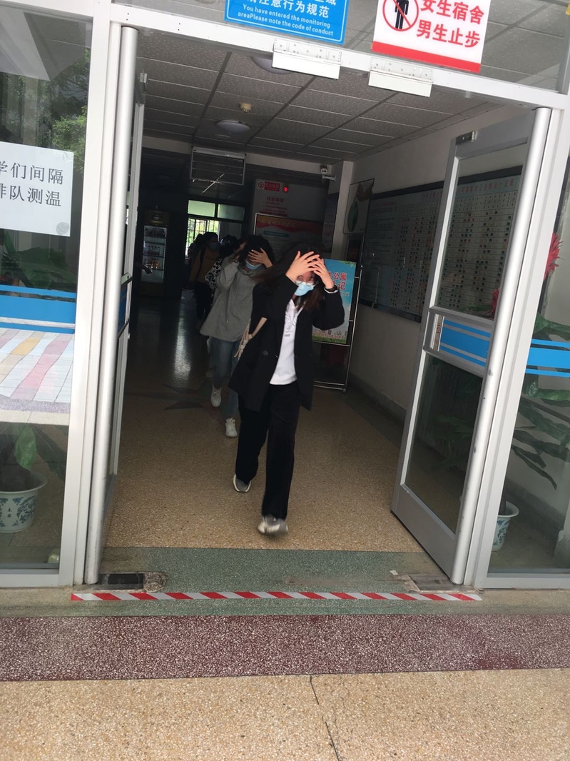 下午14:00,演练准时开始。假设接到地震预警,保卫处(应急管理中心)接报后,立即通知各相关部门启动突发事故应急处置预案,各应急小组成员迅速赶赴北校区1-4号学生公寓现场。公寓值班人员快速打开安全疏散通道,向楼内学生发出疏散警示。各楼层保卫处、学生处、学生辅导员第一时间到达各自预定执勤岗位就位,在宿舍各楼道、楼梯位置做疏散指挥工作。听到疏散警报后,同学们迅速离开宿舍,按照安全转移路线要求,佩戴口罩,用手臂保护头颈部,保持1米安全距离,低身有序撤离危险区域至楼外安全位置。