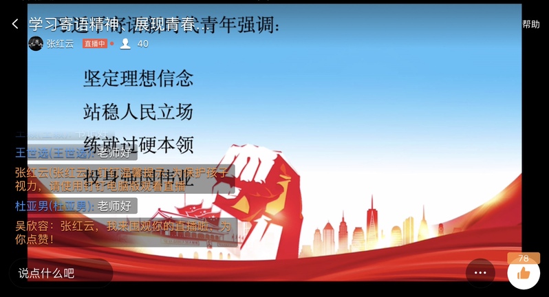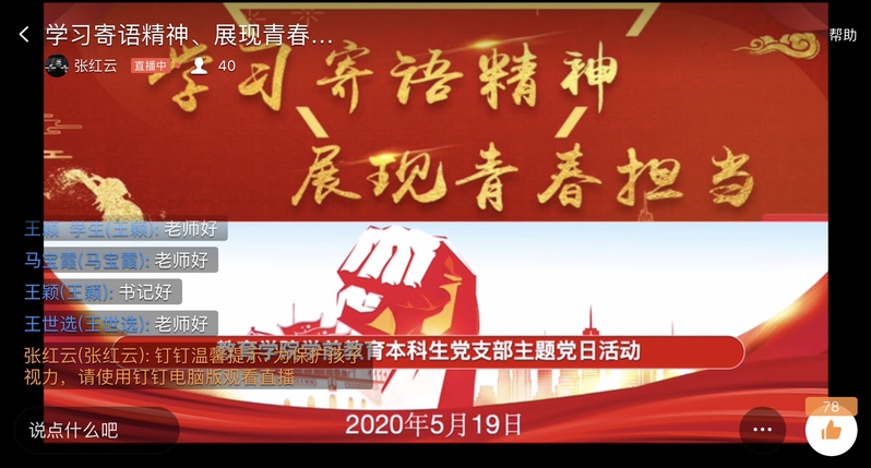 2020年5月19日下午,教育学院学前教育本科生党支部通过钉钉群直播的方式,开展线上主题党日活动,本次活动由支部书记张红云主持,主要学习习近平总书记对新时代青年的寄语、以及如何展现青春担当。支部全体党员党员参加了本次主题党日活动。