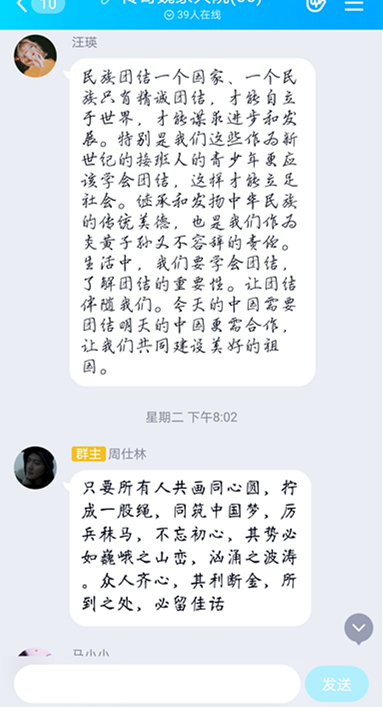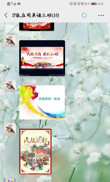 外语学院各团支部围绕主题,精心组织,以丰富多彩的活动形式展现出同学们拥护民族团结、维护国家统一的力量和热情。团日活动中,各班团支书组织同学认真学习贯彻习近平总书记关于民族工作重要论述和在全国民族团结进步表彰大会上的重要讲话精神及学校相关文件精神;各班同学在网上积极参加“美育云端课堂”活动,用红色文化艺术加强理想信念教育、厚植爱国主义情怀。2019级应用英语三班团支部在群内分享歌曲:“中华民族一家亲”小视频,发表同学们互相发表对民族团结重要性的认识,少数民族学生分享家乡的风俗习惯;2019级预科班同学分享民族团结好故事,在微信QQ群内展开热烈讨论。
