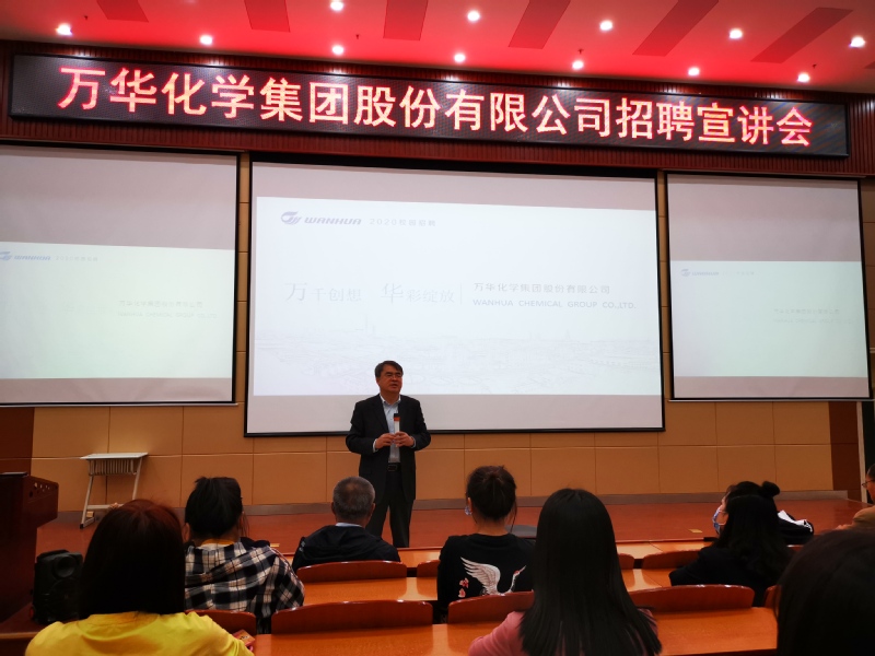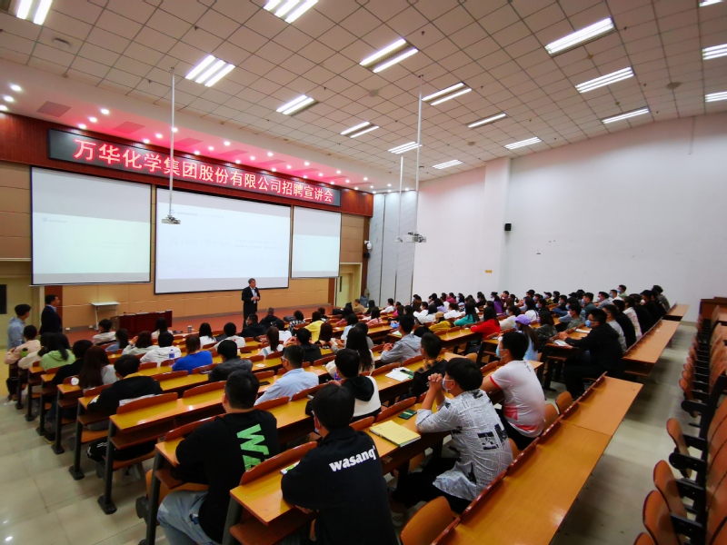 宣讲会在5-205举行,参加本次宣讲会的是2021届专科生。宣讲前赵继德副总从他对万华集团公司所听、所看、所感等三个方面用幽默风趣的语言为大家介绍了万华化学。在会后的现场答疑环节,宣讲人对薪酬待遇、岗位需求、晋升等问题为大家一一解答。宣讲会现场气氛热烈,会后同学们也结合自身具体情况和特点与宣讲人进行深入交流。