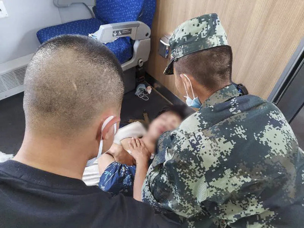 图为丁玮桐与列车工作人员紧急施救